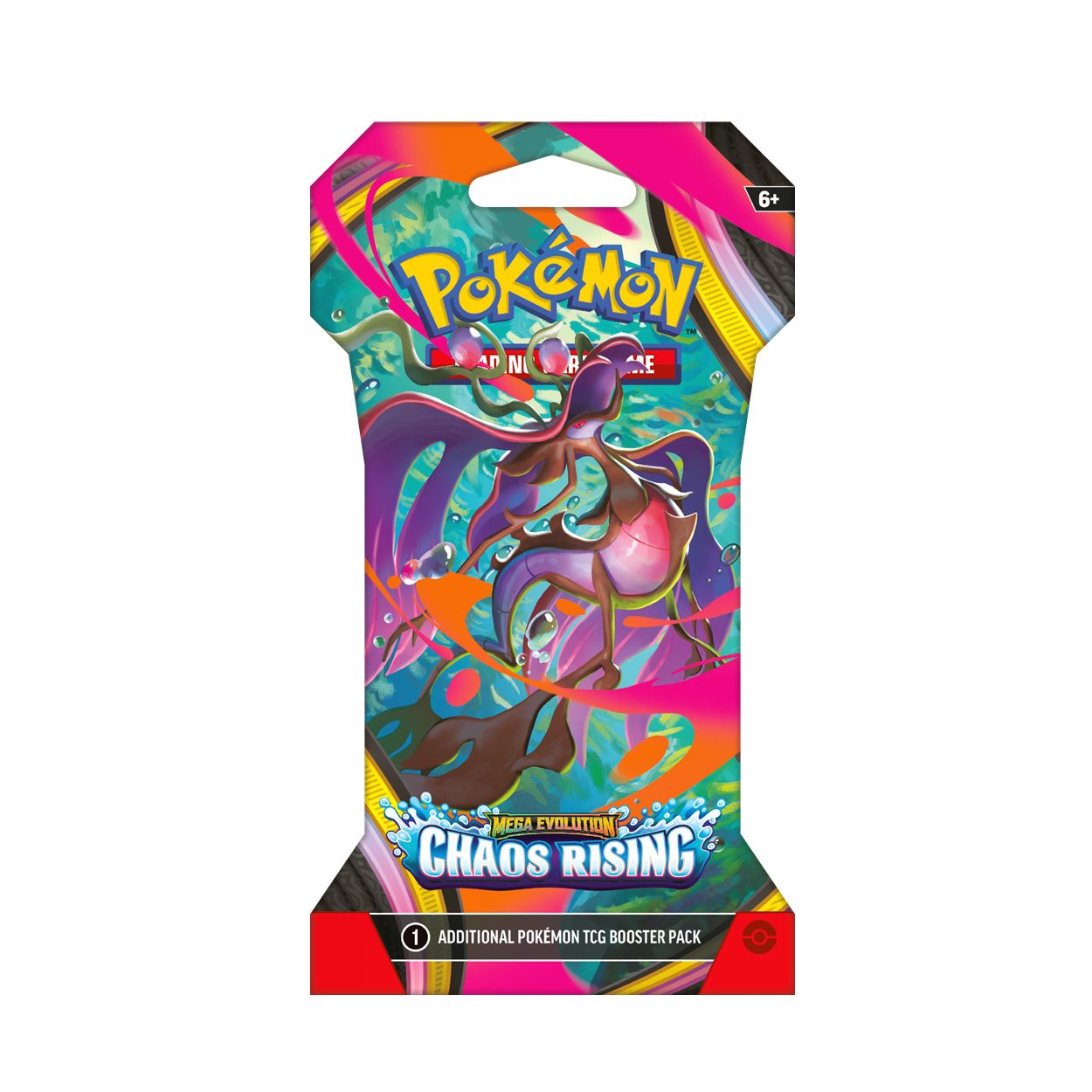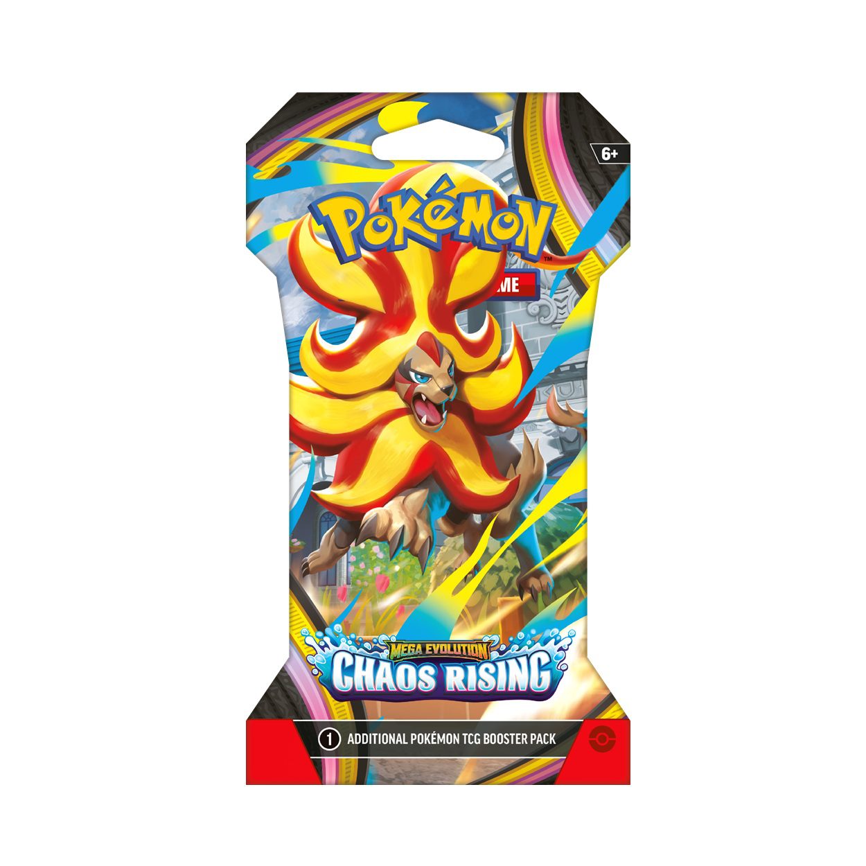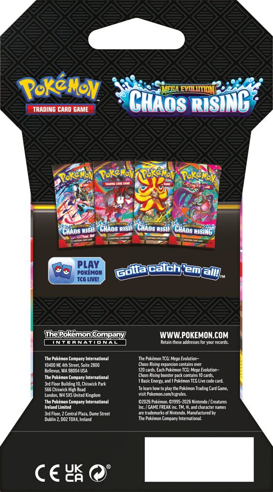 De Chaos Rising Sleeved Booster is een los Engelstalig booster pack van Mega Evolution Chaos Rising, verpakt in een kartonnen sleeve. Dit product verschijnt op 22 mei 2026 en is ideaal voor verzamelaars en spelers die op een toegankelijke manier kaarten uit deze nieuwe Pokémon set willen openen.
