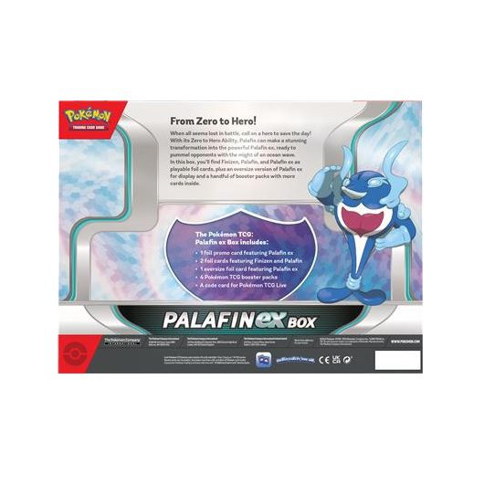 Als alles in de strijd verloren lijkt, roep dan een held op om de dag te redden! Met zijn Zero to Hero Ability kan Palafin een verbluffende transformatie maken in de krachtige Palafin ex, klaar om tegenstanders te slaan met de kracht van een oceaangolf. In deze box vind je Finizen, Palafin en Palafin ex als speelbare foil kaarten, een oversized versie van Palafin ex om tentoon te stellen en een handvol boosterpacks.