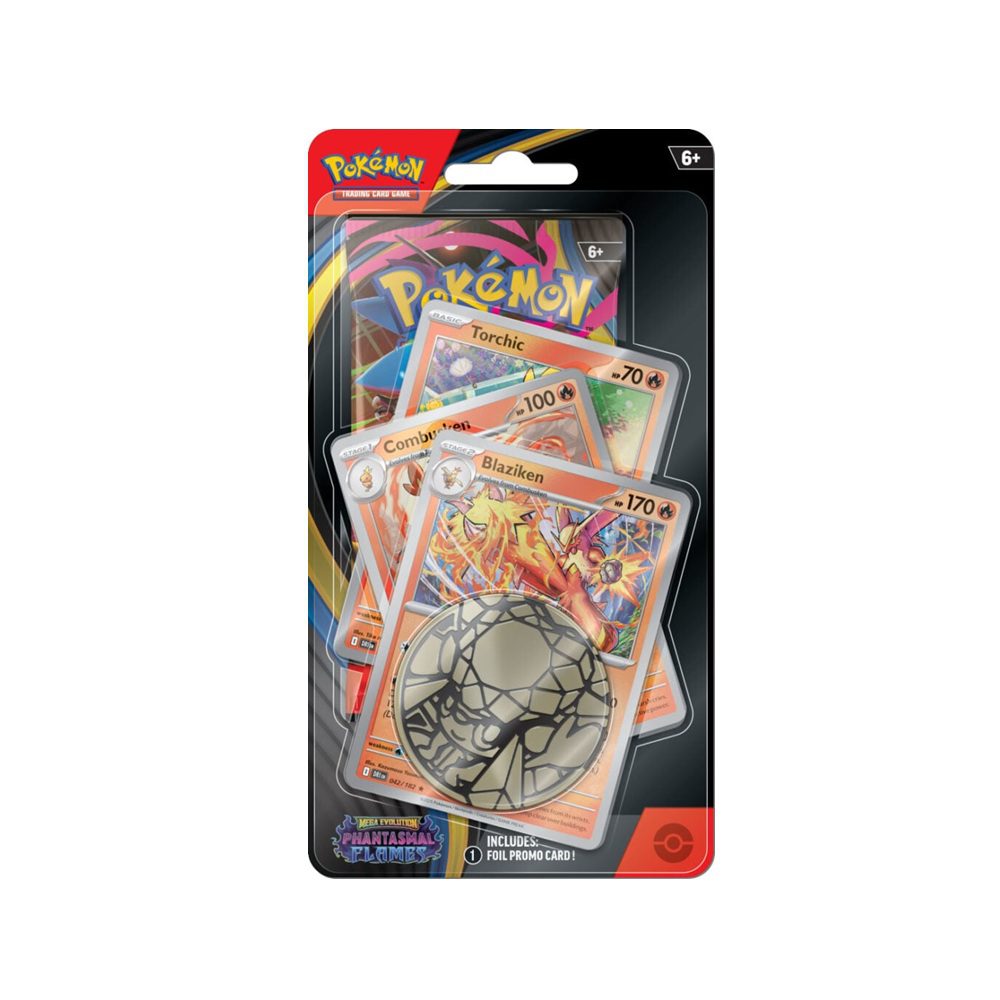 De Phantasmal Flames Premium Checklane Blister Blaziken bevat één booster pack, drie holo promo kaarten en een metallic Pokémon-munt. Met Blaziken als hoofdkaart is dit een echte blikvanger voor fans van Fire-type Pokémon en de nieuwe Mega Evolution-serie.