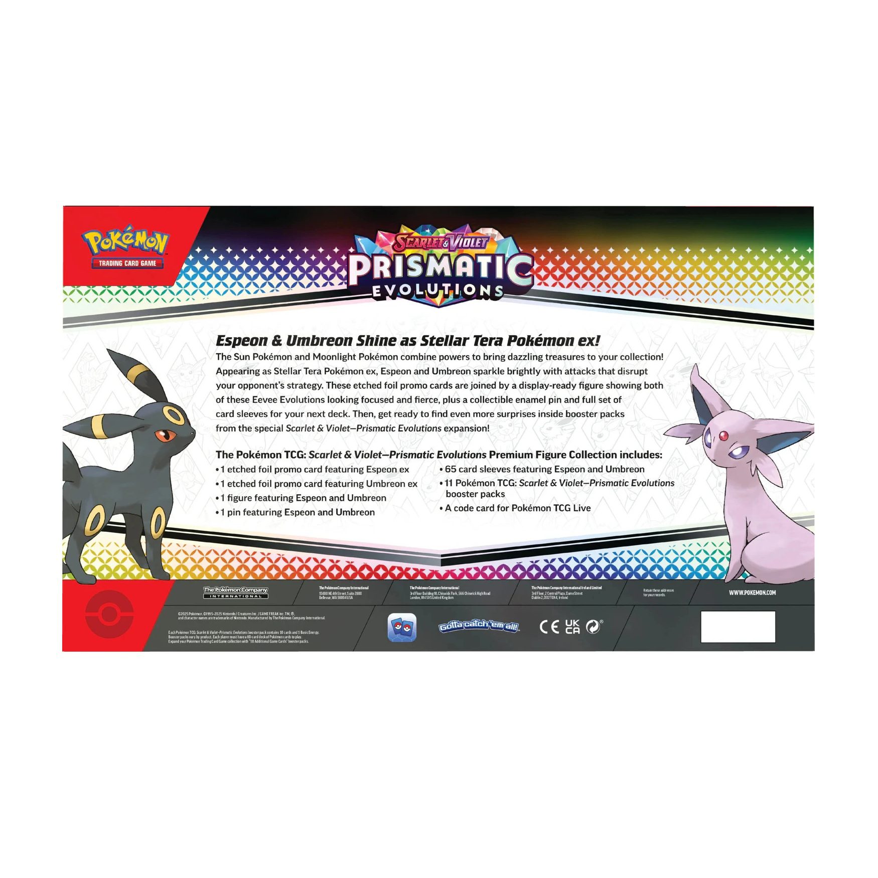 Laat de kracht van licht en schaduw samenkomen in jouw collectie en ontdek de magie van de Pokémon TCG: Prismatic Evolutions Premium Figure Collection – een schitterend eerbetoon aan Espeon en Umbreon.